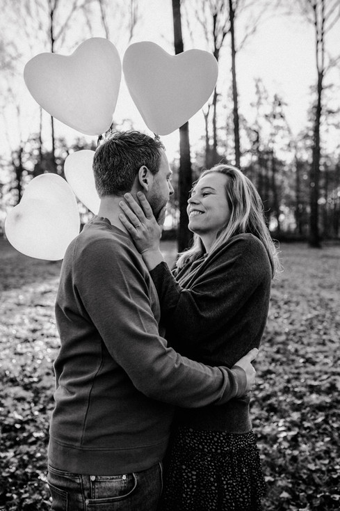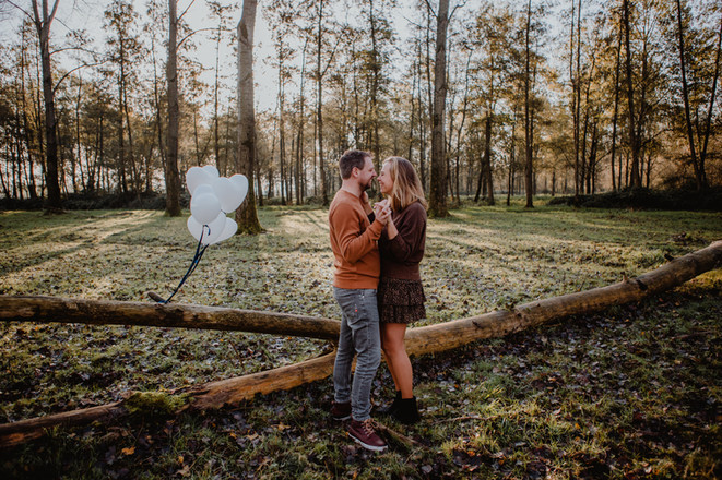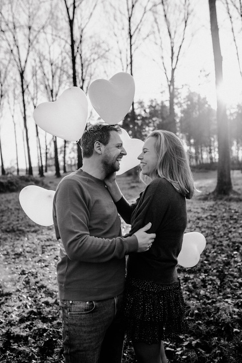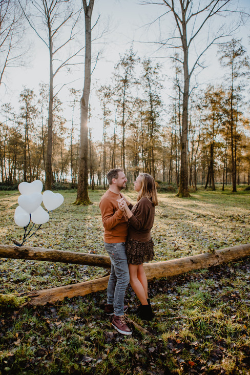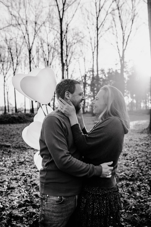 Laatst was ik opzoek naar een stelletje die voor de camera wilde staan, aangezien ik een leuk idee uit wilde werken. Ik postte een oproep op social media waar meerdere mensen op reageerden, waaronder ook Marleen. Het leuke is dat Marleen en ik op dezelfde middelbare school hebben gezeten. Echter hadden wij elkaar al enige tijd niet gezien en was het dus des te leuker dat ik Marleen en haar vriend Timo op de foto zou zetten. We kletsten via de app en maakten een afspraak voor de fotoshoot. Wat Marleen niet wist is dat Timo mij een berichtje stuurde dat hij Marleen de avond voor de fotoshoot ten huwelijk zou vragen. En hoe! Timo had de tuin bij de ouders van Marleen (en die hebben een hele gave tuin!) versierd met heel veel heliumballonnen, lampjes en fakkels en ging daartussen op zijn knieƫn. Zo romantisch! Je begrijpt wel dat ik die dag erna een stralend koppel voor mijn lens had ;)